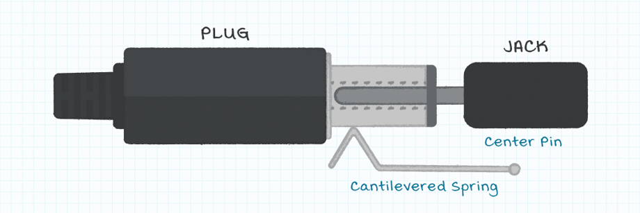 The mate to the barrel plug is a barrel jack with a pin and a cantilevered spring. The pin diameter of the jack is selected slightly smaller than that of the inner sleeve of the mating plug. The body of the jack will have a hole with a diameter that is somewhat larger than that of the outer sleeve of the matching plug. The depth of the hole in the body of the jack will be specified to be approximately the same dimension as the length of the sleeves of the plug.
