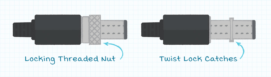 Barrel connector locking designs are often specified if ensuring a robust mechanical connection is required between the plug and the jack. Two common locking barrel connector designs are a bayonet-style and a threaded style. The threaded style of locking connector is perhaps the more popular one. In the threaded locking barrel connector, the plug employs a floating nut (most commonly 5/16-32 thread) which will screw properly onto most panel mount barrel jacks.