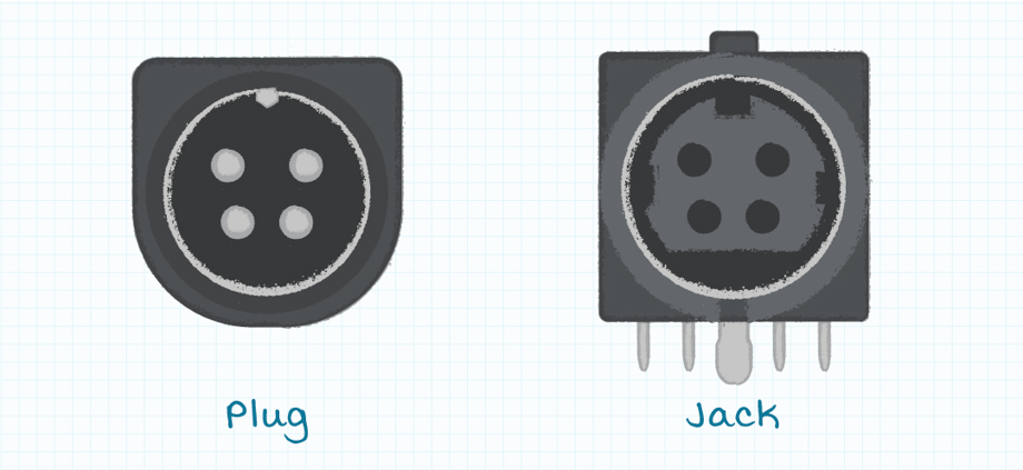 The DIN name is based upon the original German standards organization (Deutsches Institut fur Normung) and is now defined by IEC 60130-9. There are many configurations of DIN connectors available, but in this discussion, we are concerned only with the 4-pin power DIN connectors. It is difficult to find mechanical specifications for the power DIN connector, but it is reasonable to assume that connectors labeled as 4-pin power DIN connectors are compatible with each other. Like barrel connectors, power DIN connectors are available with a locking nut to prevent unintentional disconnect of the plug from the jack.