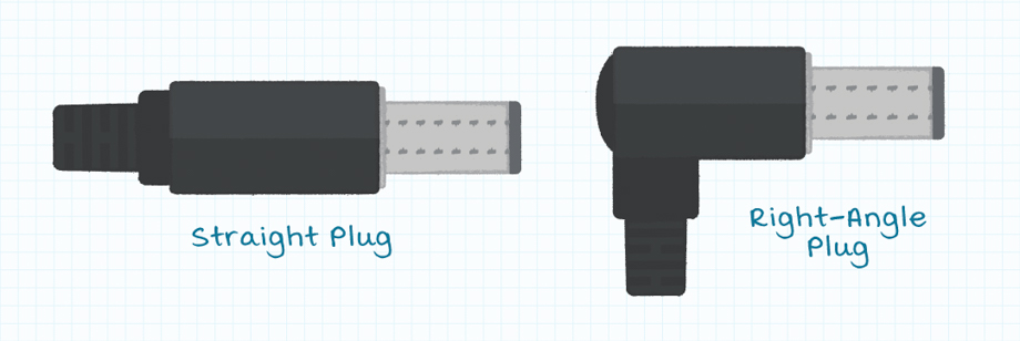 Barrel plugs are available with the cord either entering the plug in-line (axial) or at a right-angle direction (radial). The in-line configuration is the most common as it is perhaps easier to manufacture and insert the plug into the jack. The right-angle configuration provides advantages in certain applications, such as when it is desired for the cord associated with the plug to lay alongside the side of the case or chassis in which the jack is mounted. Having the cable alongside the case or chassis can make the footprint of the product smaller and can also enable the cable to be captured in a clip on the case or chassis. Another situation in which the right-angle plug is of benefit is if there is concern that the plug may be unintentionally disconnected due to tension applied by the cable. If tension is applied to the cable with a right-angle plug, there will be a torque applied to the plug-jack mechanical connection, and it will thus be more difficult to separate the connection.