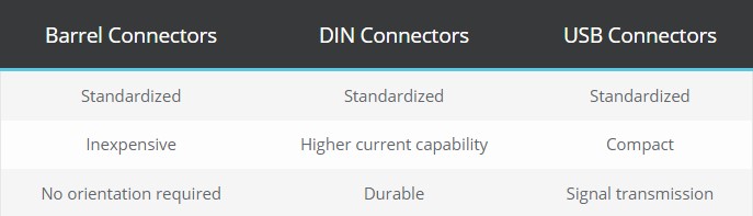 While barrel connectors are perhaps the most common style used with low and moderate power level power supplies, DIN connectors are often used when higher electrical current capacity is required than can easily be supported by barrel connectors.