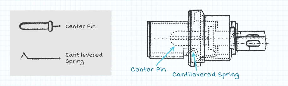 The mechanical relationships between the barrel plug and jack create the electrical connections of a barrel connector. The center pin of the jack is a loose fit within the center sleeve of the plug, and a cantilevered spring is attached to the plug's body. One of the electrical connections in the barrel connector is due to the cantilevered spring pushing against the outer sleeve of the plug. The second electrical connection in the barrel connector comes from the force of the cantilevered spring against the outer sleeve, causing the inner sleeve of the plug to be pushed against the center pin in the jack.