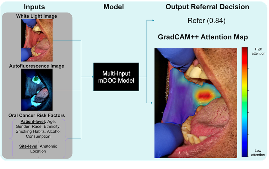 The device also represents a huge improvement over tools that are currently available to detect oral cancer, Mitbander said. Several factors make mDOC unique—it combines two types of light imaging into a single, portable device and it uses a multi-input algorithm (white-light image + autofluorescence image + patient risk factors) to recommend when a specialist referral is appropriate.