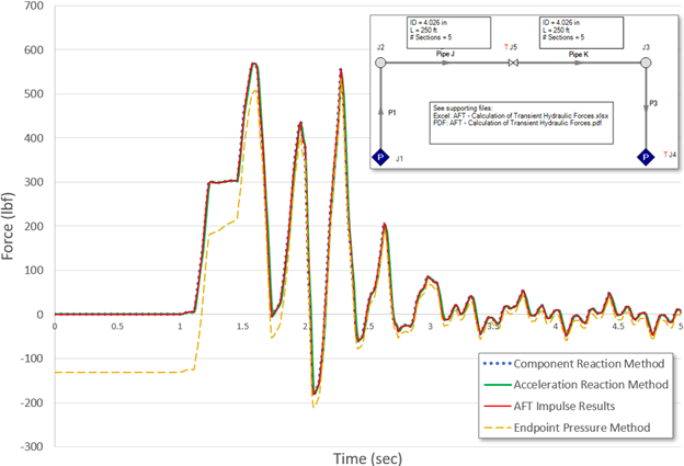 Waterhammer software such as AFT ImpulseTM can be used by engineers to determine transient pressures and velocities for liquid systems. However, engineers often take the resulting software output and attempt to use Newton by only considering pressure forces (e.g., they still use Eq. 1). This approach might seem to be appropriate, but in fact it mistakenly disregards certain parameters in Newton such as forces due to friction and momentum changes in the liquid. While it is true these disregarded parameters are often minimal and can be safely neglected, there are many cases where they are important and cannot be neglected. AFT Impulse performs a complete force balance using all parameters in Newton and is thus able to give a more accurate force prediction. More on this below.