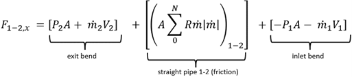 Eq. 3 is called the Component Reaction Method. Comparing Eq. 3 to Eq. 1, it is clear that Eq. 1 is a special case of Eq. 3. . First, the fluid momentum, ṁV, can and does change from point 1 to 2 because of the waterhammer wave. Second, there is friction in the pipe. If each of these terms is negligible, then Eq. 1 is a reasonable approximation to the force. Often these terms are negligible. However, there are cases when they are not. The ASME papers explain this.