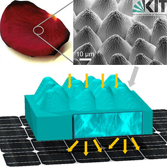 “Nature has evolved complex micro-structured and nano-structured surfaces on the leaves and petals of plants that are very efficient in harvesting incoming photons,” says Guillaume Gomard, a photonics researcher at Karlsruhe Institute of Technology’s Light Technology Institute in Germany. “As both solar cells and plants should be efficient sunlight collectors operating under various illuminations conditions, that is, under different angles of incidence, we thought solar cells might benefit from the naturally designed structures found on plants.”