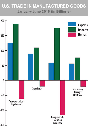 It’s true that the U.S. imports many more goods than it exports to the rest of the world. According to the U.S. Census Bureau, $931.2 billion in manufactured goods were imported in the first six months of 2016, compared to $522.6 billion in exports. Even in the industries where the U.S. manufacturers export the most—transportation, chemicals, computers and electronics, and non-electrical machinery— there was a net trade deficit.