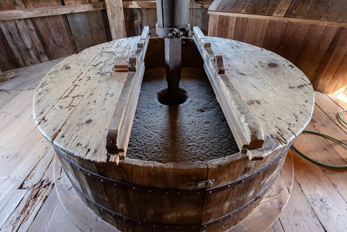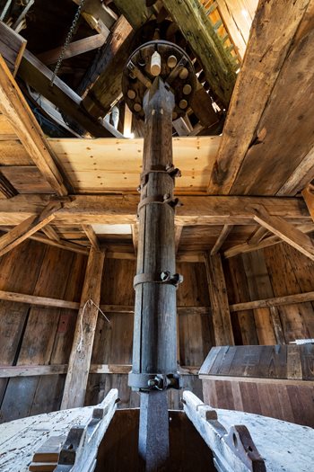 What’s most remarkable about the design is that the gears do the main business sit in a little square-based triangle-roofed house atop the otherwise octagonal structure. At the base of this cap is a circular wooden track that fits in a wooden groove at the top of the tower. This allows the cap to be turned so that the vanes are always facing into the wind. A “tail pole,” that extends from the cap to the ground, can be pushed to rotate this uppermost structure.