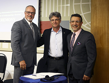 Domingos Rade (center), scientific technical director at ABCM, joined ASME’s Paul Stevenson (left) and John Falcioni for the signing of renewal of a Memorandum of Understanding between the two organizations at the ASME Leadership Summit Brazil 2018.